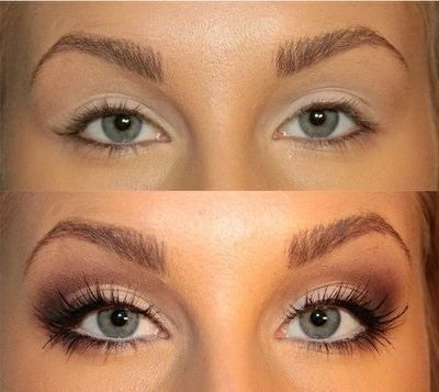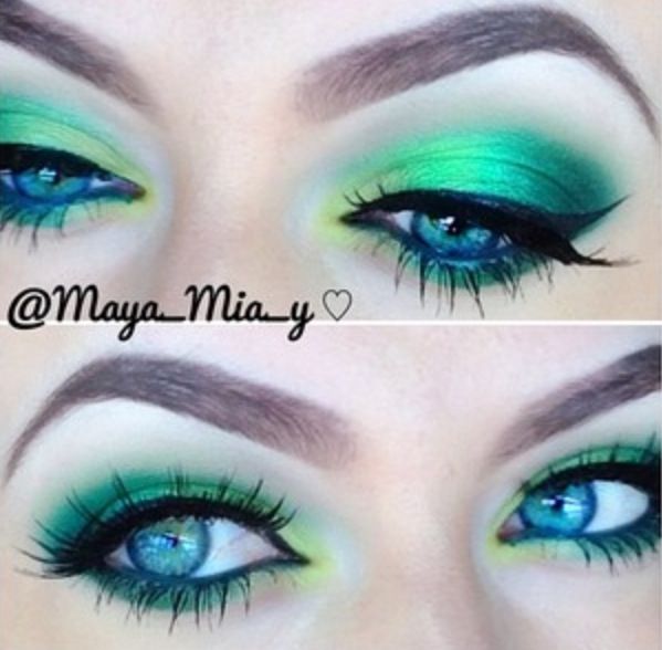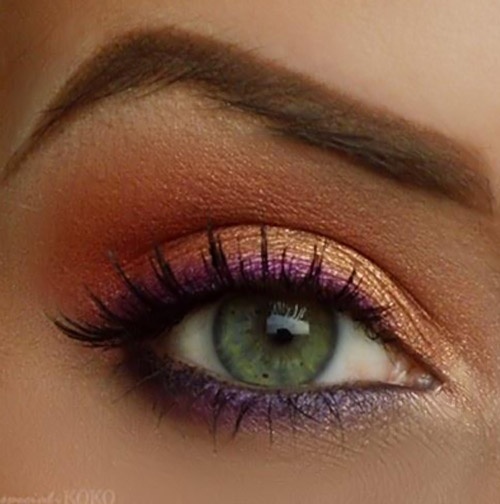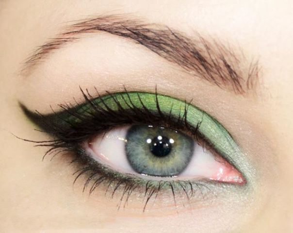 Dark Smokey eye makeup looks great on green eyes. And makeup that is red-based Bring out your gorgeous green eyes. Bronze, copper and gold looks absolutely fabulous with green eyes for evening. Brown or dark green eyeshadow with flecks of gold are also terrific choices.