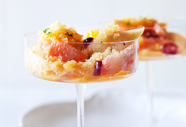Orange Granita with Honey-Poached Pears, Cranberries and Citrus