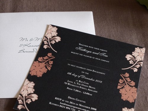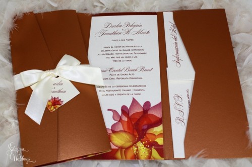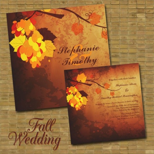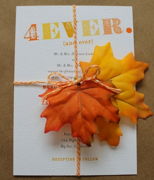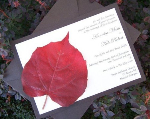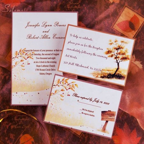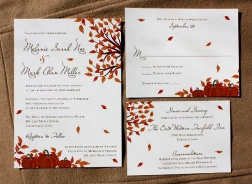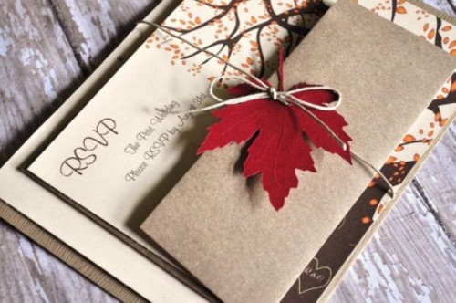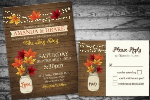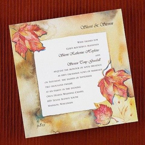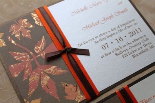 Color for your invitations should be one or more of the fall colors like brown, cream, green, burgundy, yellow, orange, etc. To add an elegant touch you can also use leaf patterns, rhinestones and bows.