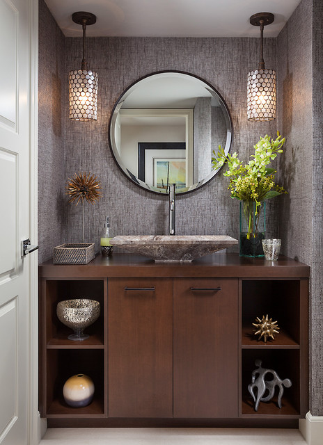 Don’t let the small scale of a powder room dissuade you from being creative; give this petite space the play it deserves with its own polished look. Powder room design can be fun because it’s a small space so it doesn’t take too much money or effort to make it a beautiful room. When designing and decorating a powder room, the focus should be on the vanity, mirror, basin, faucet and walls.