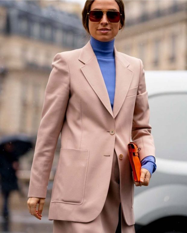 Blue in light and delicate tones always gives a sweet touch to looks. To generate more contrast, camel tones are a very good option. However, if you don’t want to go too naïve, you can opt for more serious cuts like a structured blazer or tailored trousers. To complete the look, grab some elegant heeled ankle boots in brown. They never fail!