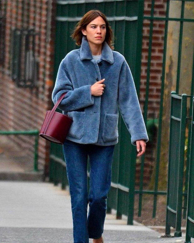 If you are looking for a look with an elegant and chic air, playing with neutral colors is the best option. We suggest you wear a gray thick knit sweater and combine it with a burgundy suede skirt and black ankle boots. Put the finishing touch to the look with a classic cut coat in a darker gray, which helps to create a subtle contrast of colors, and you will get a most sophisticated outfit.